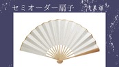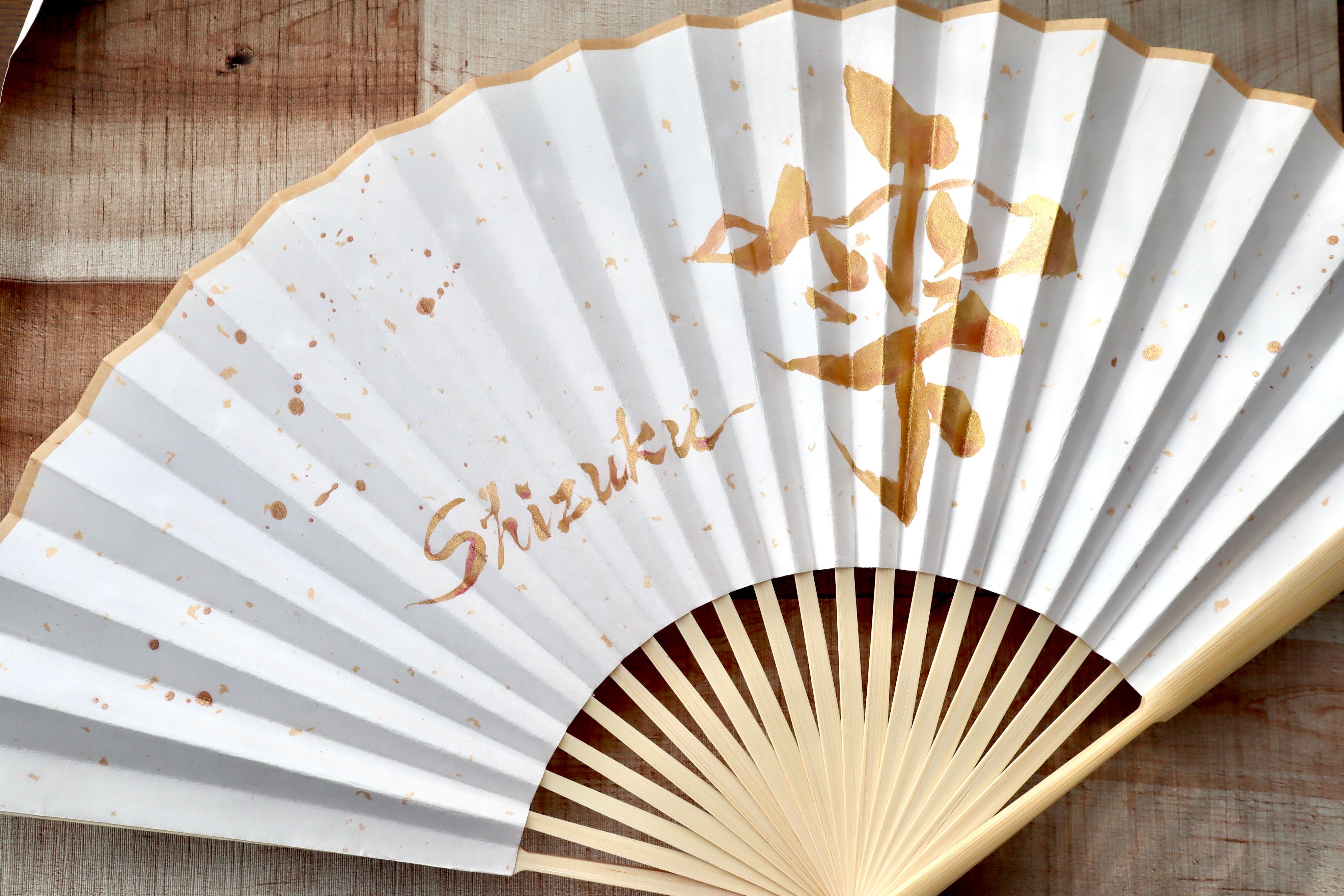 私がおまかせで扇子に直接、金色の墨汁で書きます